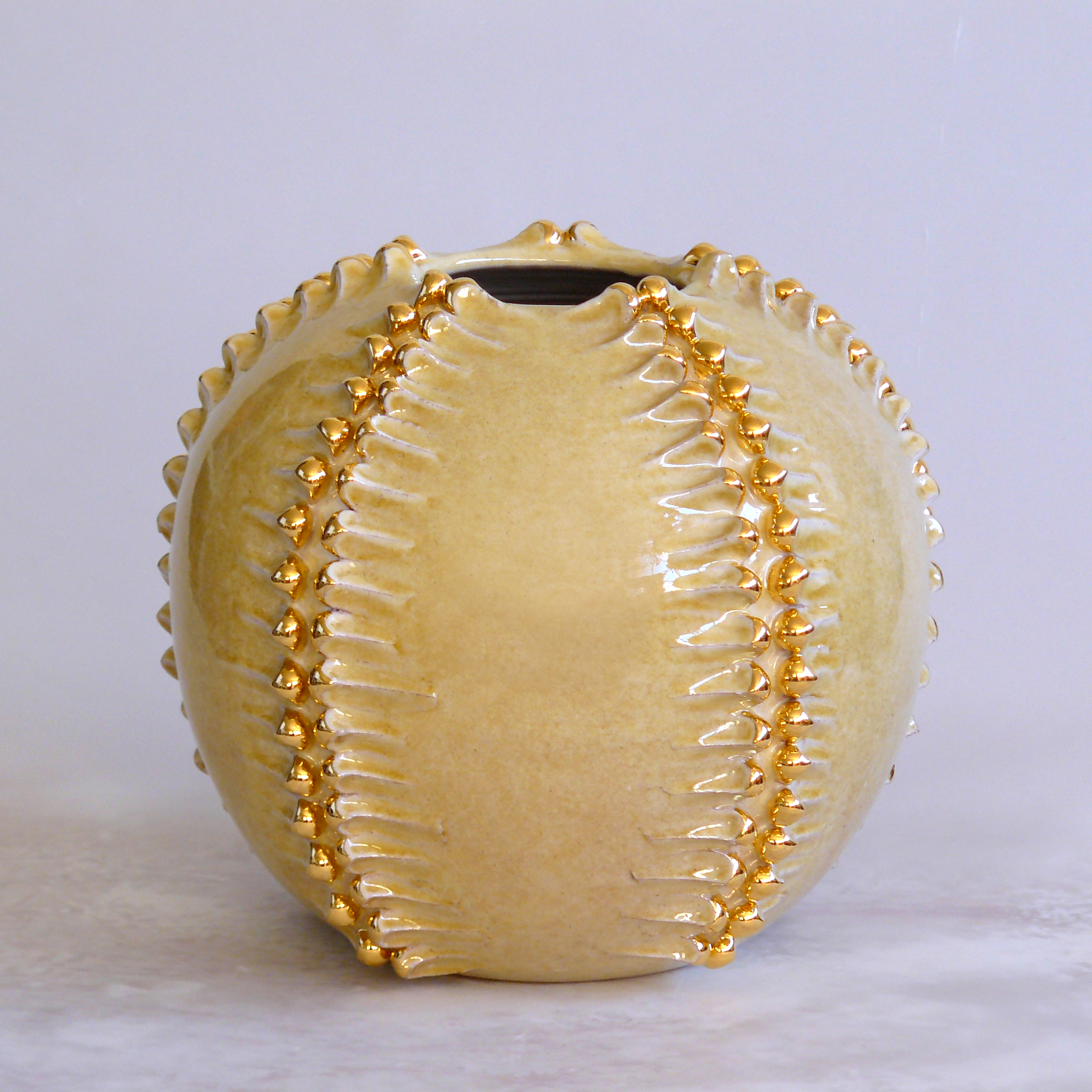 Designul spectaculos are la bază motive în relief inspirate de forma conurilor de pin, dispuse sub forma unor registre verticale elegante. Nuanța de galben pai este pusă în valoare de accentele aurii strălucitoare, care conferă un aer rafinat și prețios, transformând bolul într-un obiect central de decor.