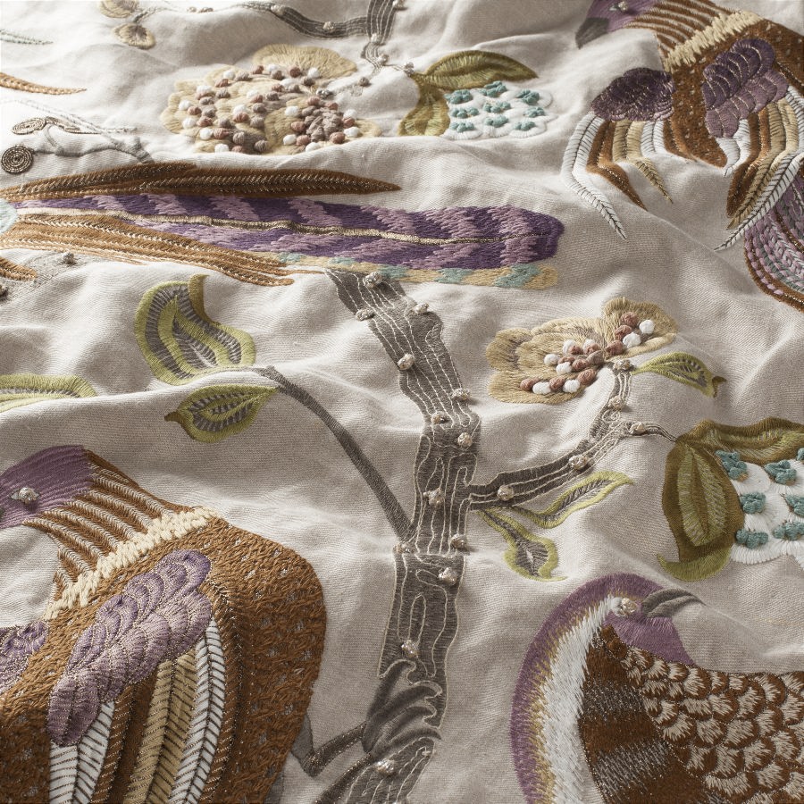 COSMIC KISS este o draperie și tapițerie premium brodată, o adevărată capodoperă de artizanat realizată din 100% in natural. Prin broderia sa spectaculoasă, parțial lucrată manual, această țesătură combină frumusețea autentică a inului cu motive vegetale și păsări exotice, aducând mister și rafinament în orice spațiu interior.