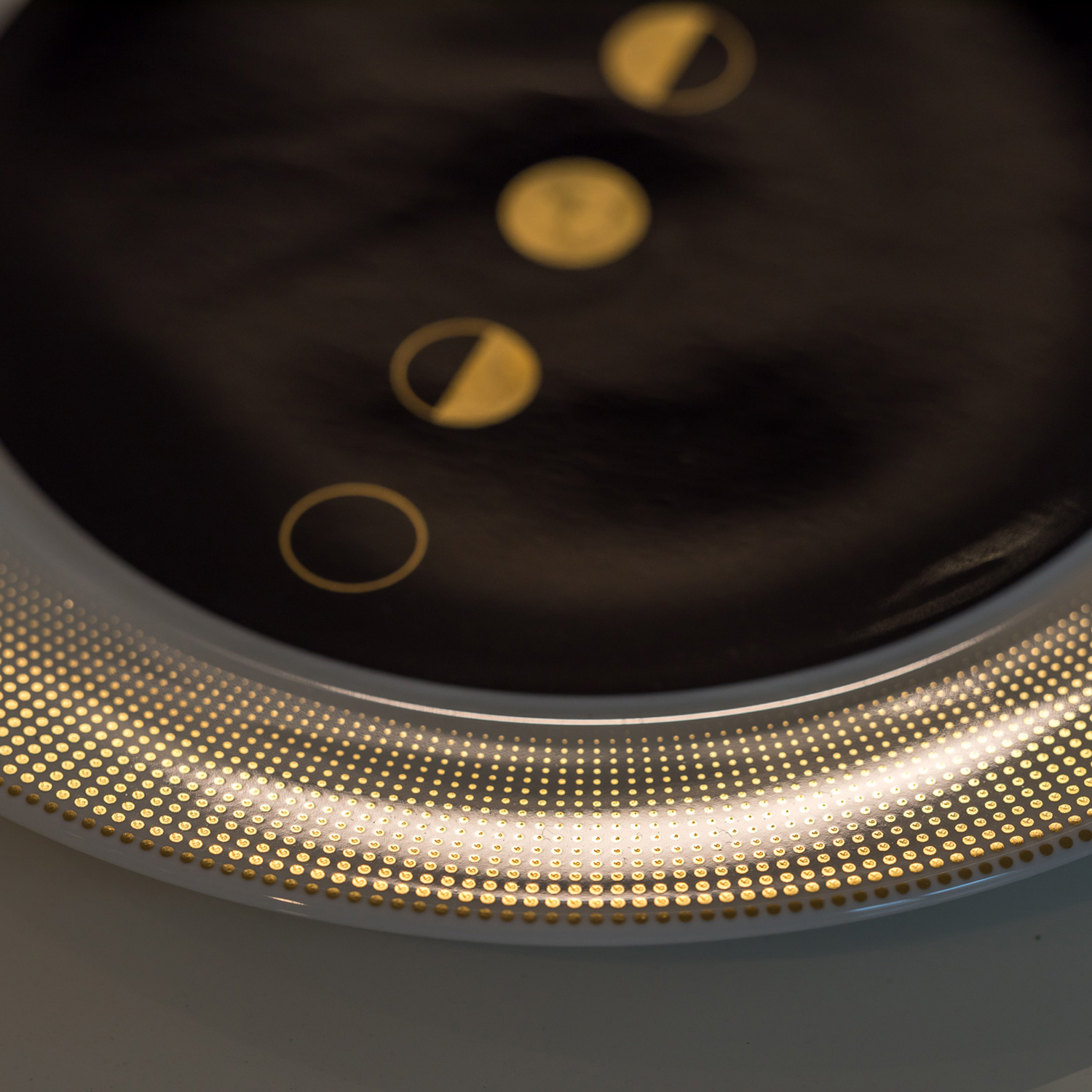 Prin designul CLAIR DE LUNE, atractia magica a lunii se transforma in numeroase compozitii extraordinare in negru, alb si auriu, pe portelanul foarte fin, fabricat de FÜRSTENBERG.