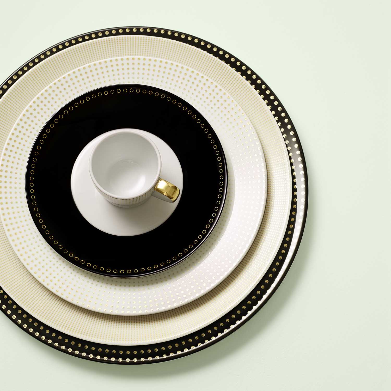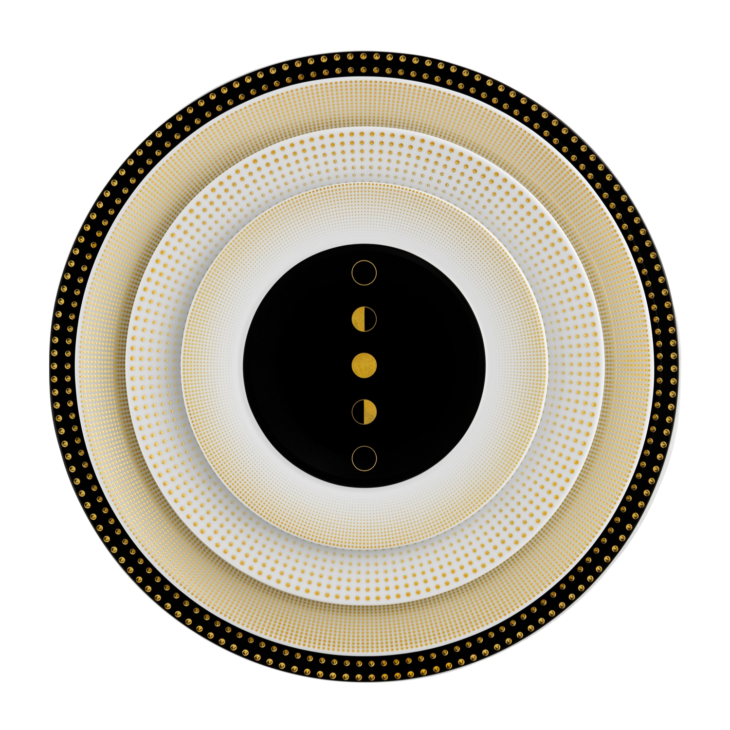 Prin designul CLAIR DE LUNE, atractia magica a lunii se transforma in numeroase compozitii extraordinare in negru, alb si auriu, pe portelanul foarte fin, fabricat de FÜRSTENBERG.