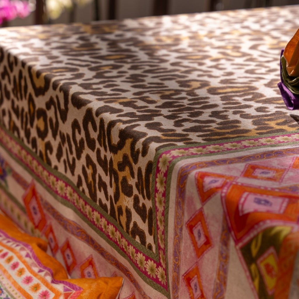 Adu pe masa ta un suflu exotic și vibrant cu fața de masă JURTA, realizată din in si bumbac și decorată cu un mix îndrăzneț de imprimeu leopard, geometrii tribale și nuanțe calde ce amintesc de culorile condimentelor orientale. Creată de Tessitura Toscana Telerie – Italia, această piesă spectaculoasă este un omagiu adus detaliilor artizanale și culturilor îndepărtate, transformând orice masă într-o experiență vizuală rafinată.