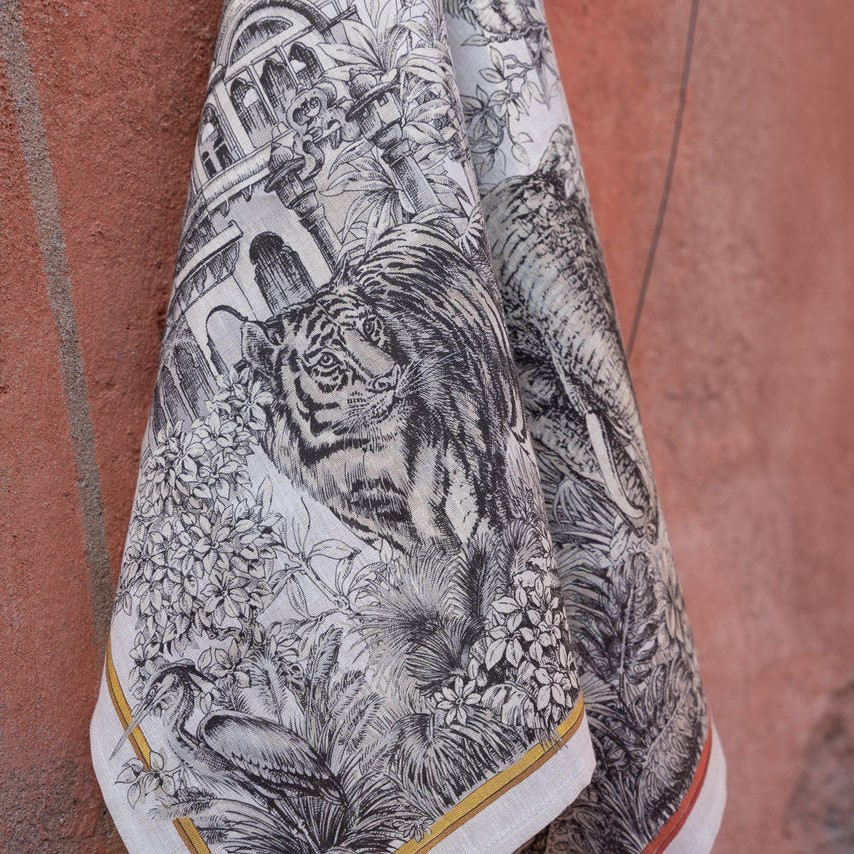 Transformă masa într-o scenă de poveste exotică cu fața de masă TANTRA, realizată din in 100% natural și imprimată cu un design artistic ce amintește de o gravură veche, încadrată de un chenar decorativ elegant. Creată de Tessitura Toscana Telerie – Italia, această piesă unică este inspirată de călătorii imaginare, ruine ascunse în junglă și fantezii orientale, dând naștere unei compoziții spectaculoase și rafinate.