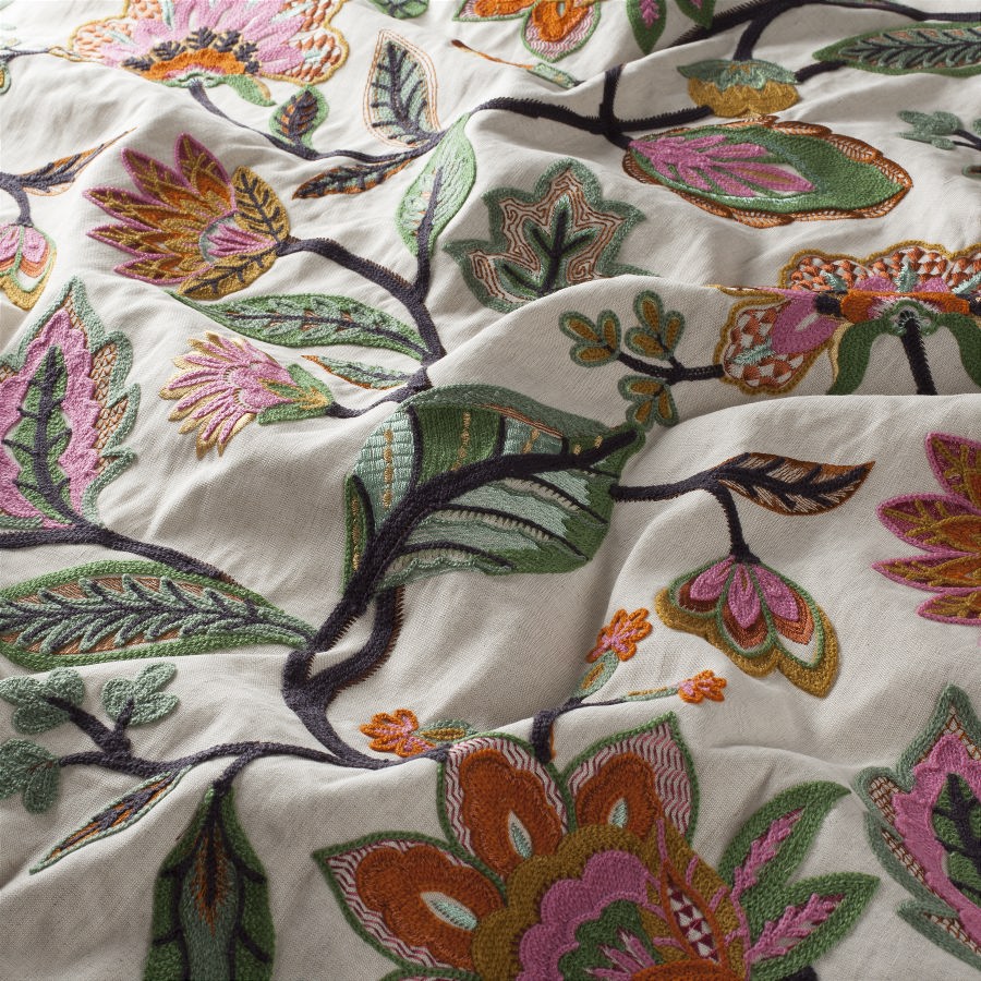 Contrastul dintre suportul mat și broderia cu aspect ușor satinat creează un joc subtil de lumini și umbre, punând în valoare motivele florale și conferind spațiului o notă sofisticată, dar caldă. Țesătura filtrează lumina într-un mod plăcut, contribuind la o atmosferă relaxantă și primitoare.
