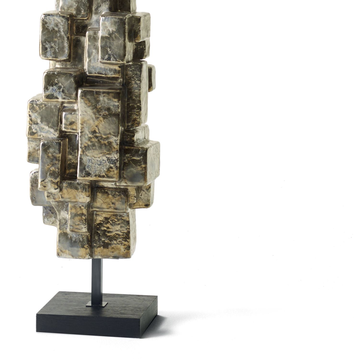 Lampa de masă Marvin, în versiunea cu bază din ceramică în culoare platină cu patină, este o piesă statement de design contemporan, creată pentru interioare sofisticate care valorizează subtilitatea finisajelor și expresivitatea formelor. Tonul rece, metalizat, îmbogățit de patină delicată, conferă suprafeței o profunzime elegantă și o senzație de material prețios, accentuând relieful sculptural al bazei.