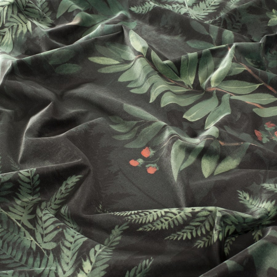 MYSTIC FOREST este o catifea imprimată spectaculoasă, cu un model floral luxuriant de ferigi și pădure, inspirat din picturile murale antice pompeiene și realizat prin tehnici ce evocă efectul artistic al frescei.