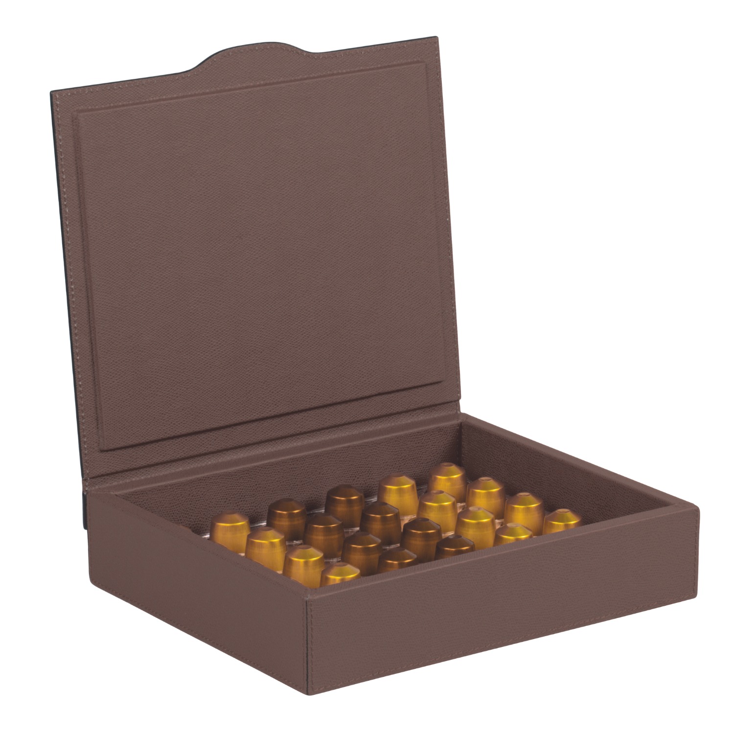 Cutia din lemn este acoperita complet cu piele Nappa. Insertia din plexiglas asigura organizarea capsulelor.