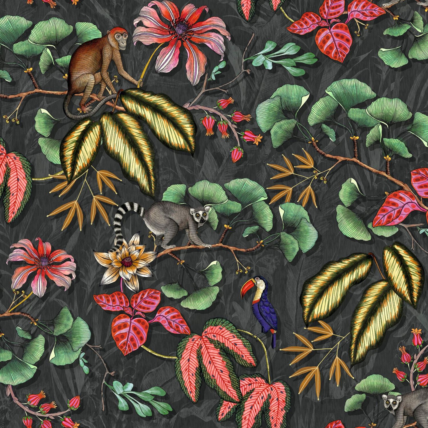 Tapetul DIVINE transformă pereții într-o scenă exotică spectaculoasă, inspirată de junglele luxuriante ale Indiei. Designul său cucerește prin detaliile atent ilustrate: maimuțe jucăușe, păsări viu colorate, flori tropicale și fructe îmbietoare, toate armonizate într-o compoziție artistică vibrantă.
