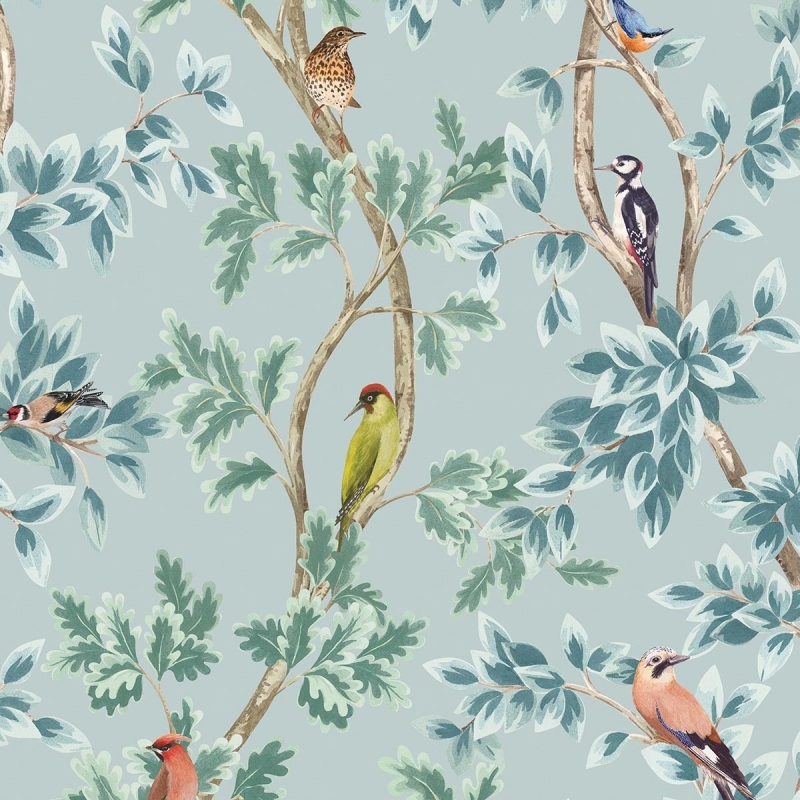 Tapetul NETHERFIELD de la Osborne & Little aduce în interior frumusețea naturală a grădinilor englezești. Modelul prezintă ciocănitori, gaițe și alte păsări de grădină așezate pe ramuri bogate în frunziș, într-o compoziție veselă și armonioasă.