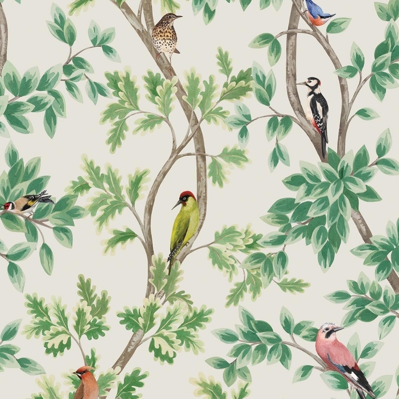 Tapetul NETHERFIELD de la Osborne & Little aduce în interior frumusețea naturală a grădinilor englezești. Modelul prezintă ciocănitori, gaițe și alte păsări de grădină așezate pe ramuri bogate în frunziș, într-o compoziție veselă și armonioasă.