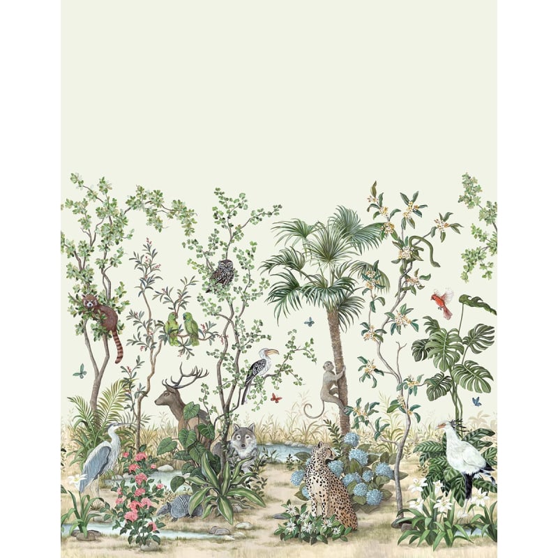Tapetul panoramic GINKO, creat de artista Marie Hartig, este o invitație într-o lume fantastică, unde fauna exotică și vegetația luxuriantă coexistă în echilibru perfect. Decorul redă scene spectaculoase cu animale surprinzătoare – lupul și armadillo sub un copac ginkgo, panda roșu și leopardul –, alături de păsări exotice și plante rare.
