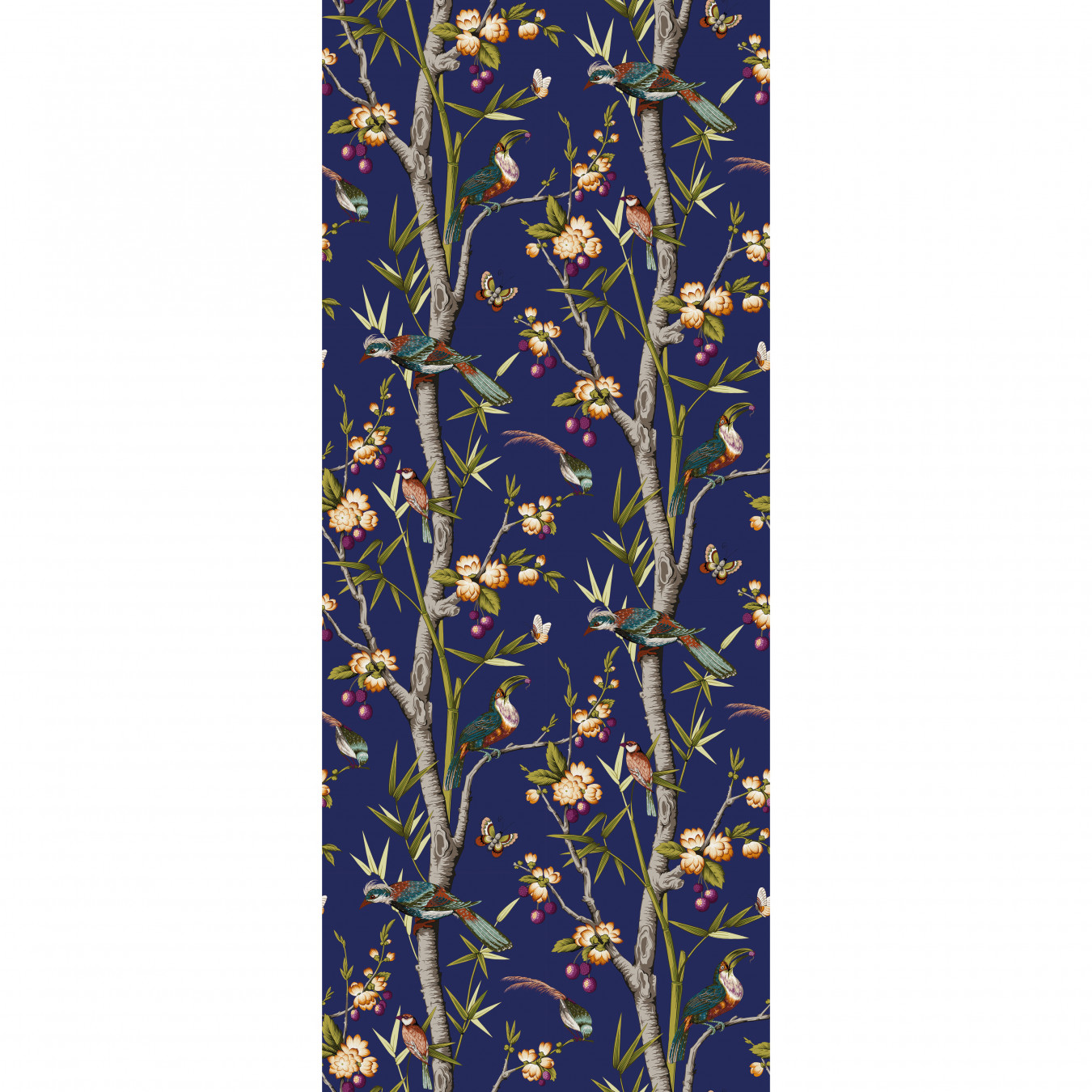 Tapetul panoramic JOSEPHINE de la Nobilis readuce la viață farmecul unui design clasic reinterpretat într-o viziune modernă și sofisticată. Tipărit pe suport prețios de pai japonez, decorul surprinde o scenă exotică plină de culoare și vitalitate: păsări cu penaj spectaculos odihnindu-se la umbra bambușilor și a unui copac înflorit, încărcat cu fructe rare.