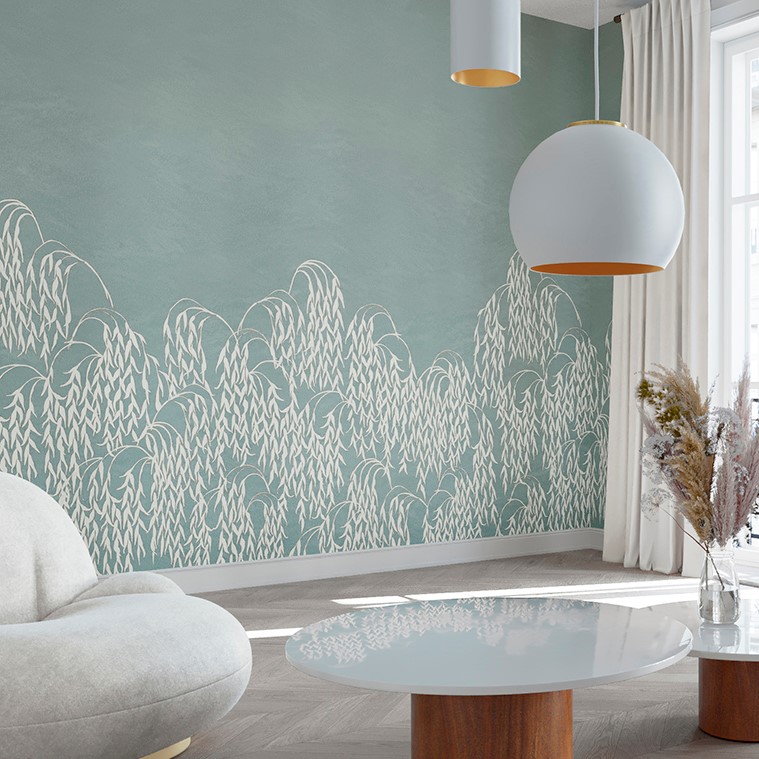 LES SAULES este un tapet panoramic de lux, inspirat de frumusețea salciilor plângătoare, adevărate simboluri de grație și rafinament. Ramurile lor elegante se transformă într-o dans al frunzișului, un spectacol vizual care îmbină armonios patina, designul și peisajul natural.