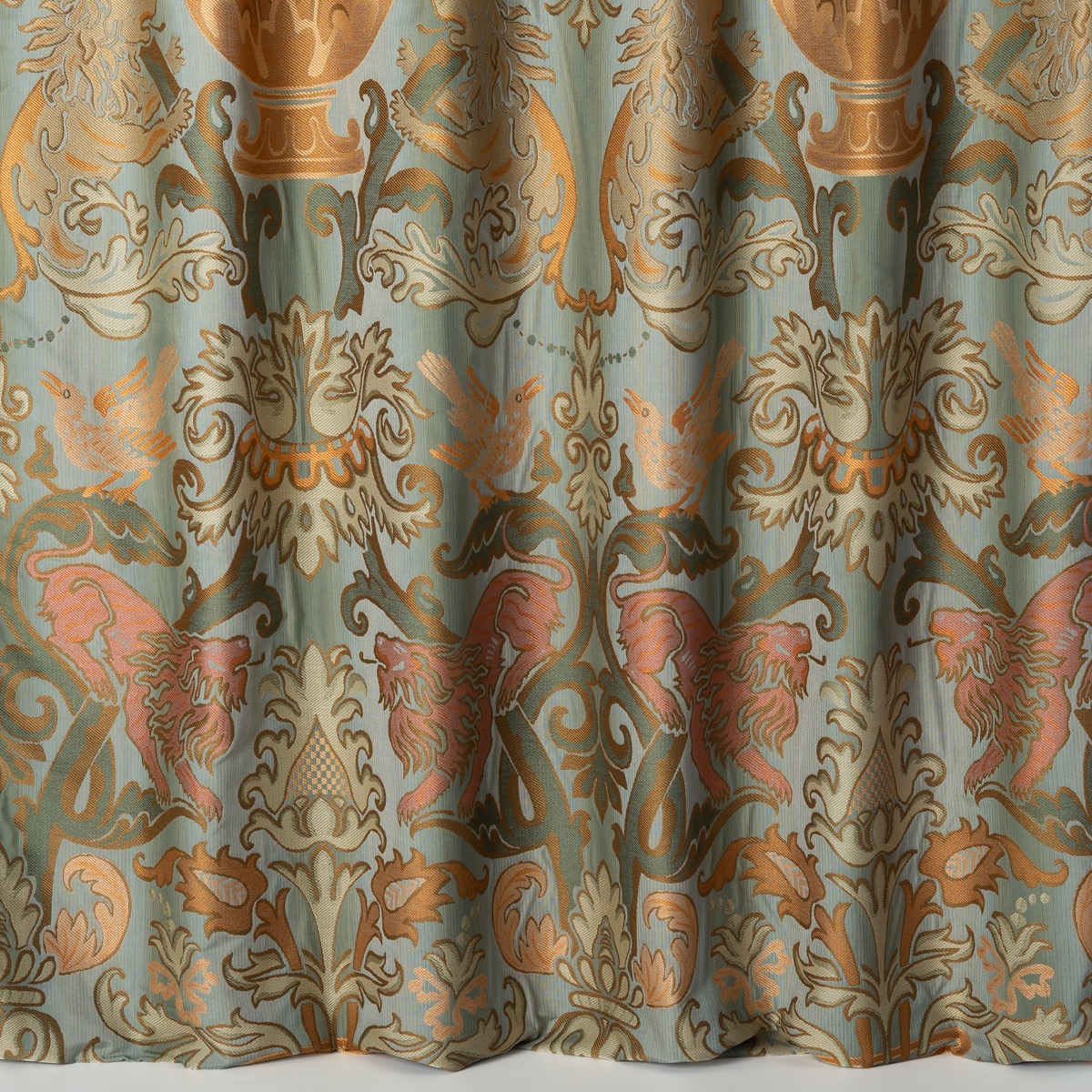 Țesătura Erasmo aduce un omagiu rafinat stilului baroc al secolului XVII, reinterpretând cu eleganță motive clasice precum lei, vase ornamentale și păsări. Realizată dintr-un amestec premium de bumbac și vâscoză, această draperie combină rezistența materialelor naturale cu strălucirea subtilă a vâscozei, oferind un aspect prețios și o textură plăcută la atingere.