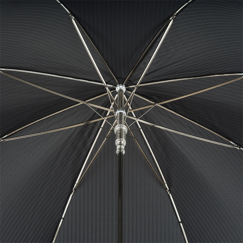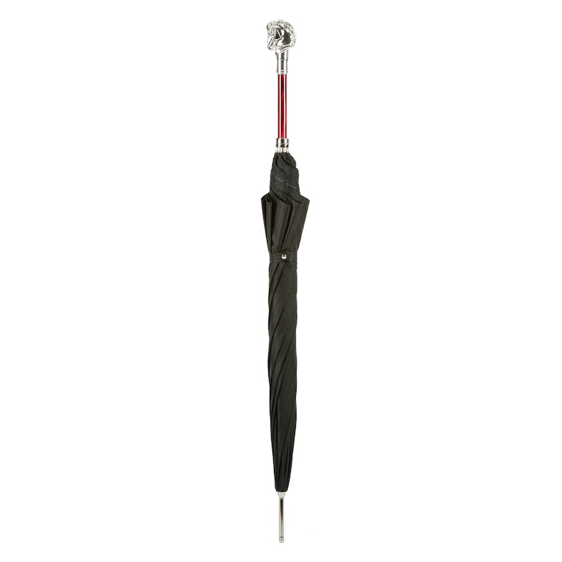 Umbrela Pasotti Silver Horse este un accesoriu de lux, lucrat manual în Italia, care combină eleganța clasică cu forța și noblețea simbolului ecvestru. Exteriorul său negru sobru se îmbină armonios cu mânerul decorativ în formă de cal argintiu, realizat din metal de înaltă calitate, ce adaugă un aer impunător și sofisticat.