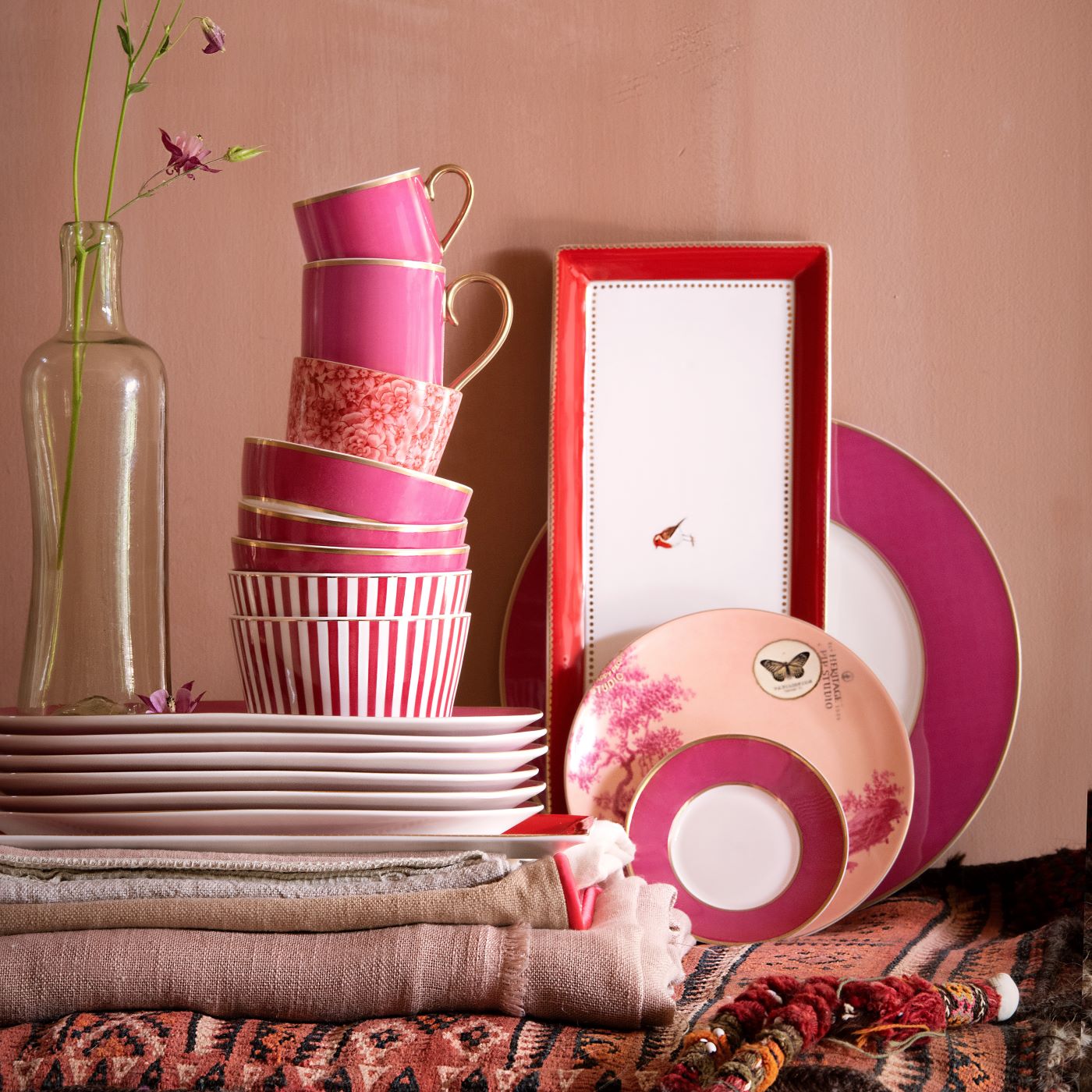 Colectie eleganta de vesela pentru ceai si cafea, decorata cu benzi aurii si fucsia.